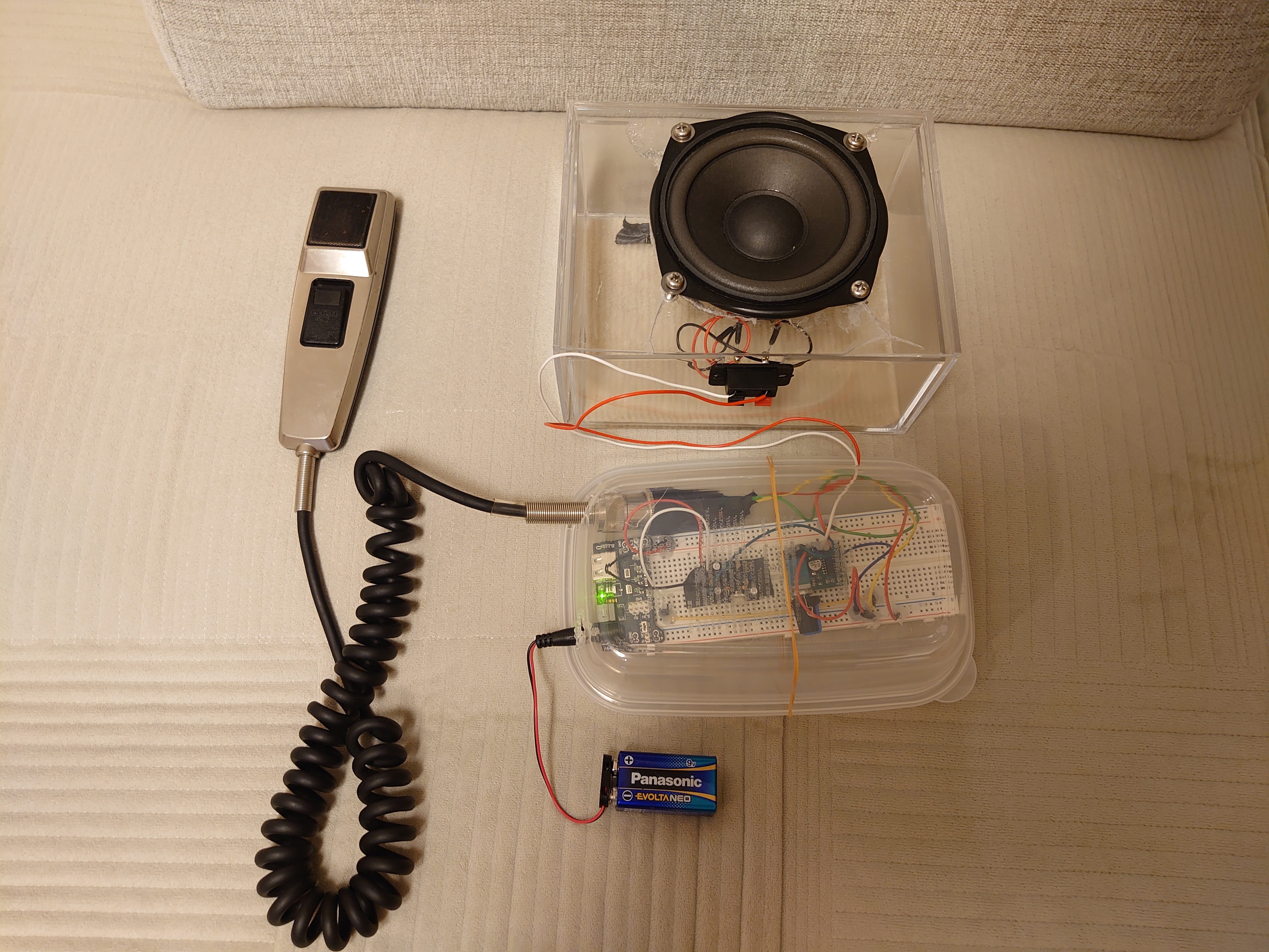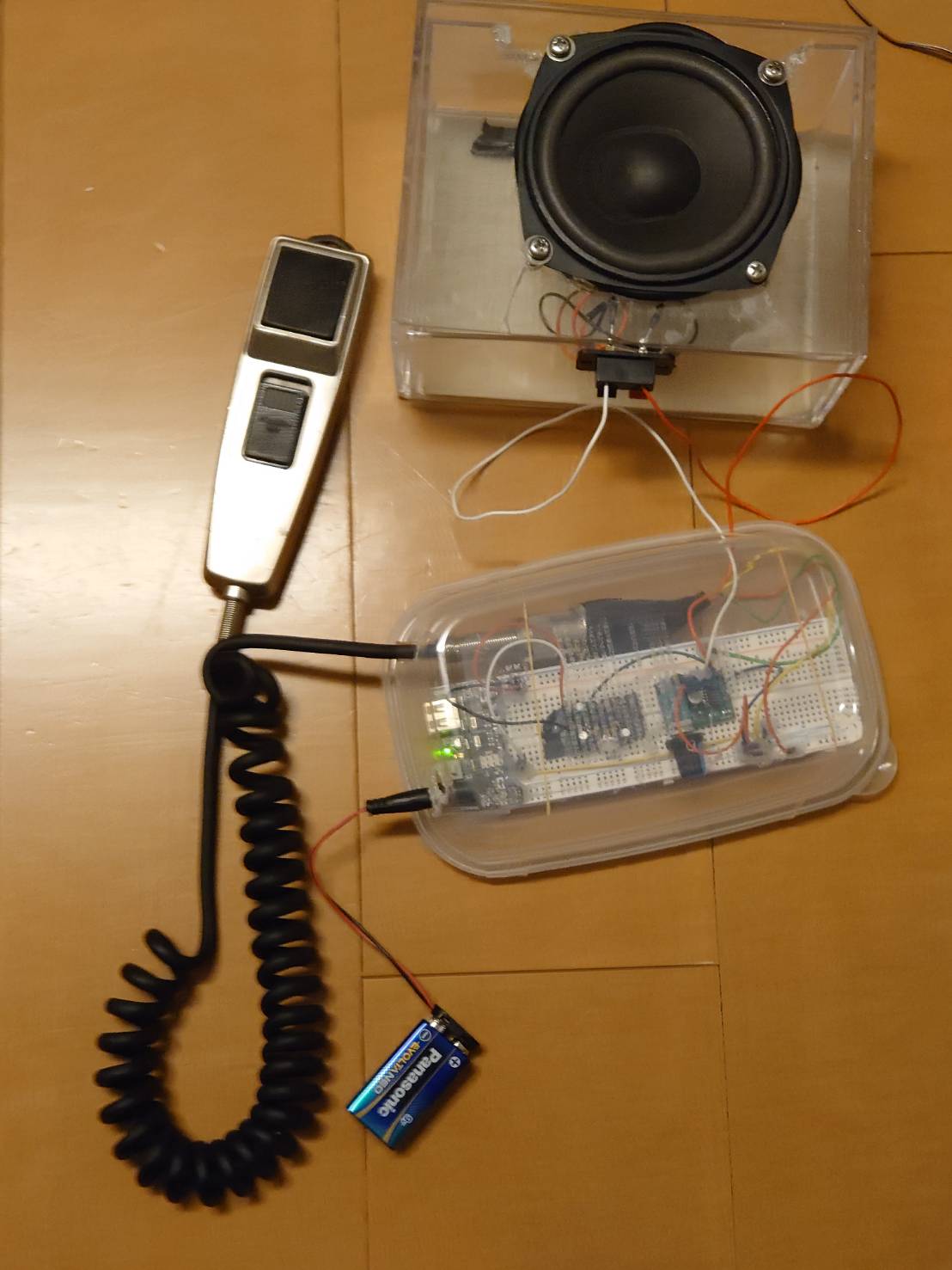 音声は Elekit NT-5(マイクアンプ) → PAM8403(小型アンプ) → スピーカーの順に増幅・出力します。