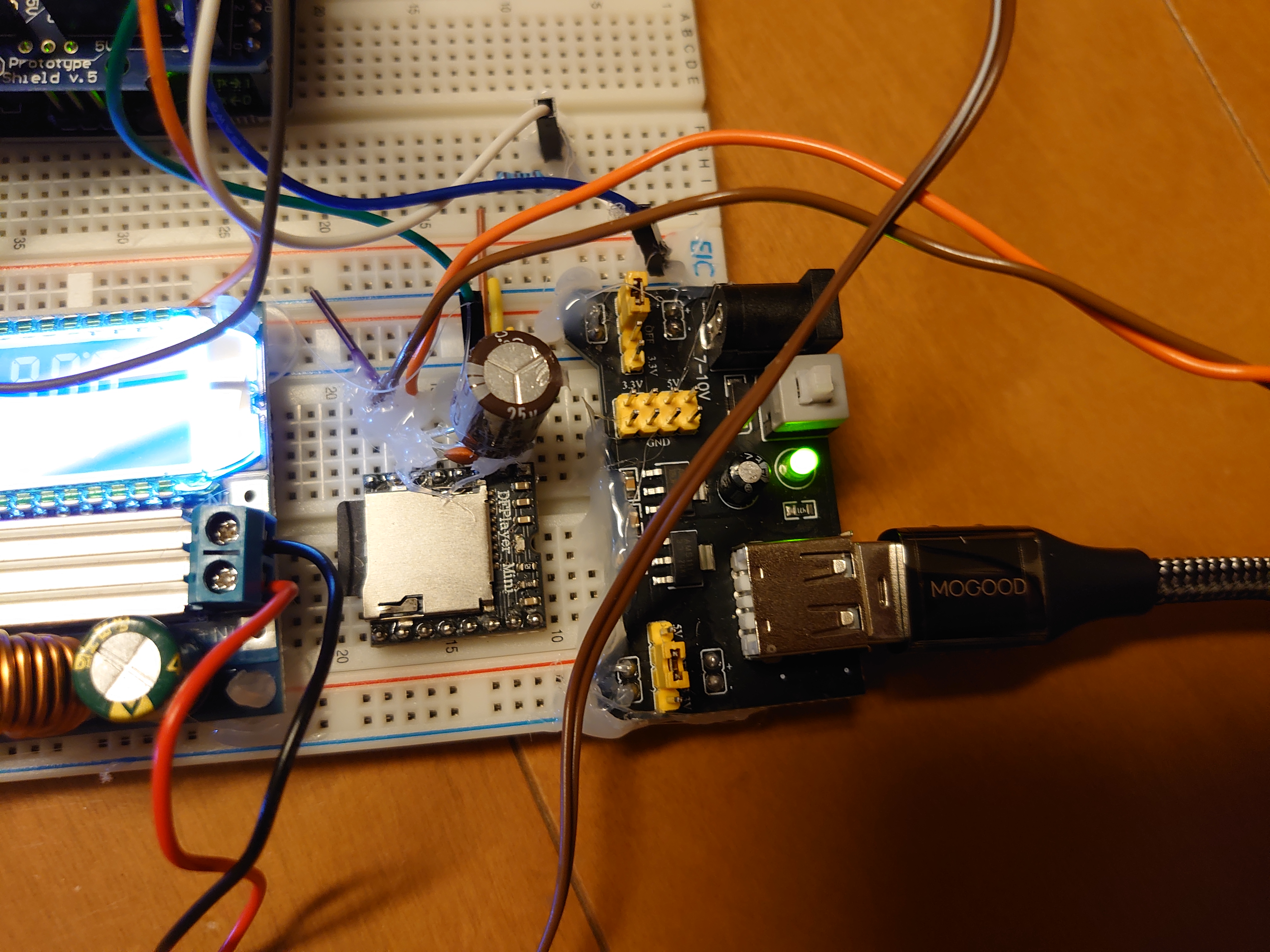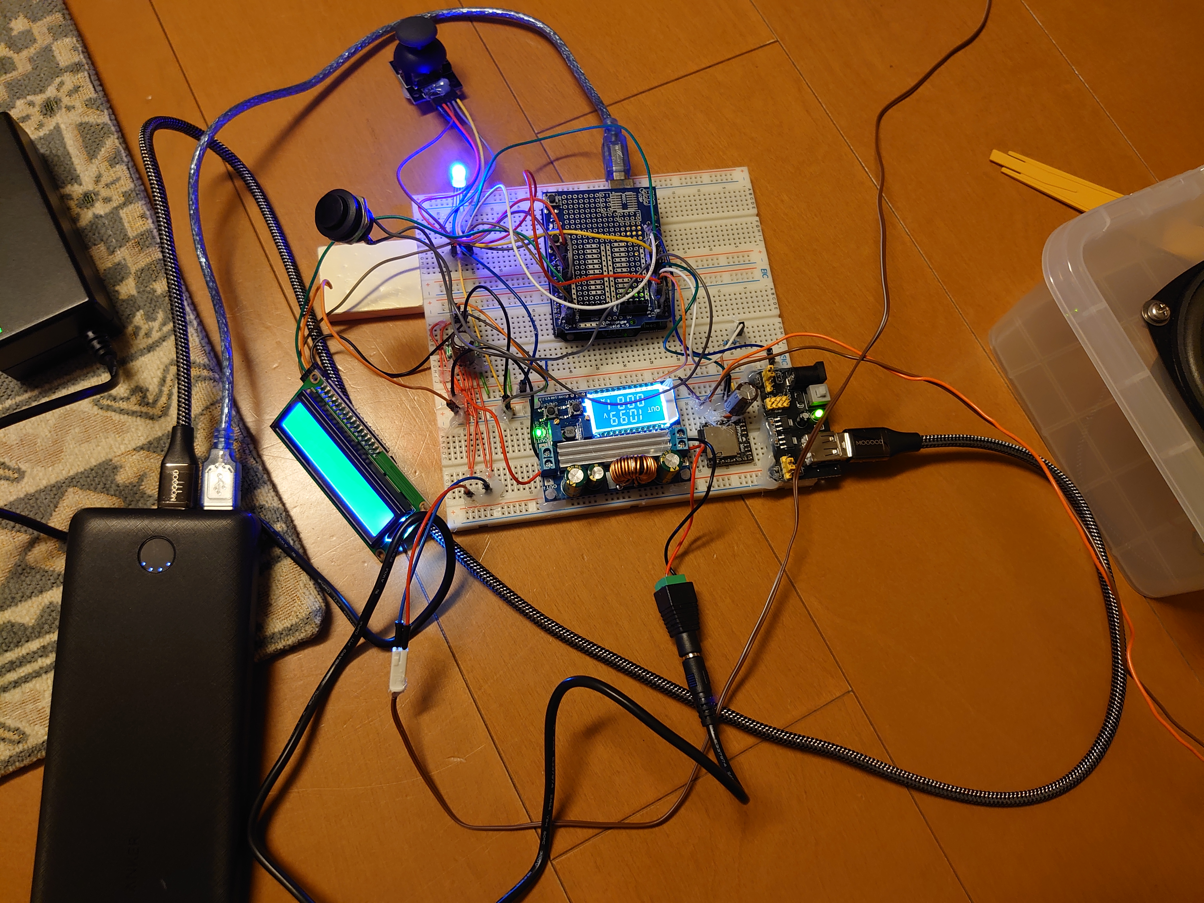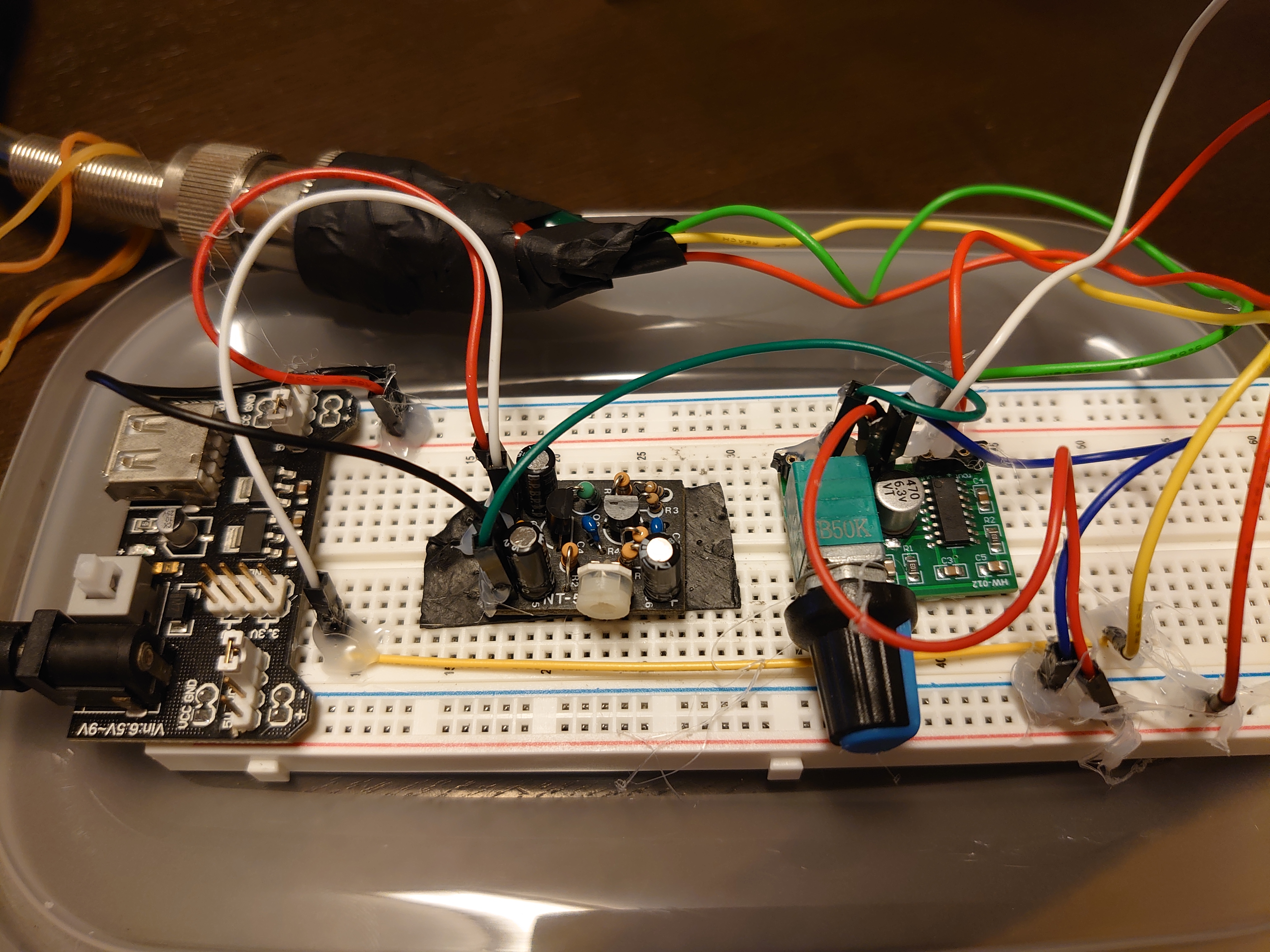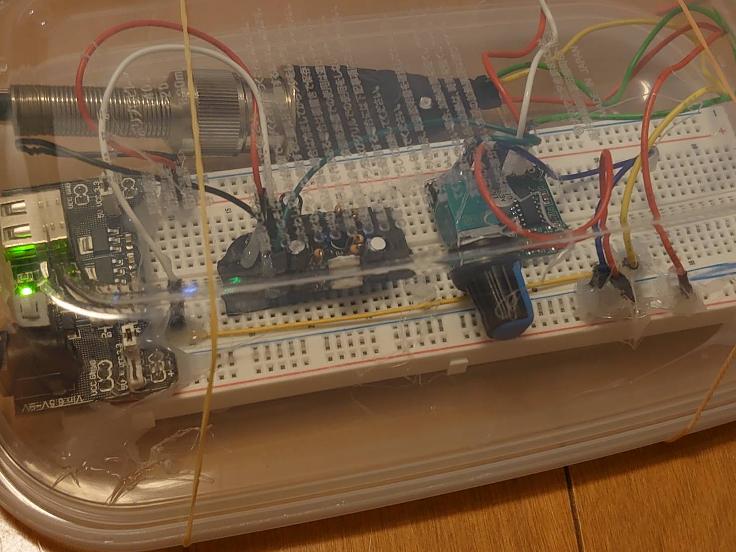 なるべくはんだ付けをせず、ブレッドボードとジャンパワイヤで組みました(外れ防止にグルーガンで固定)。