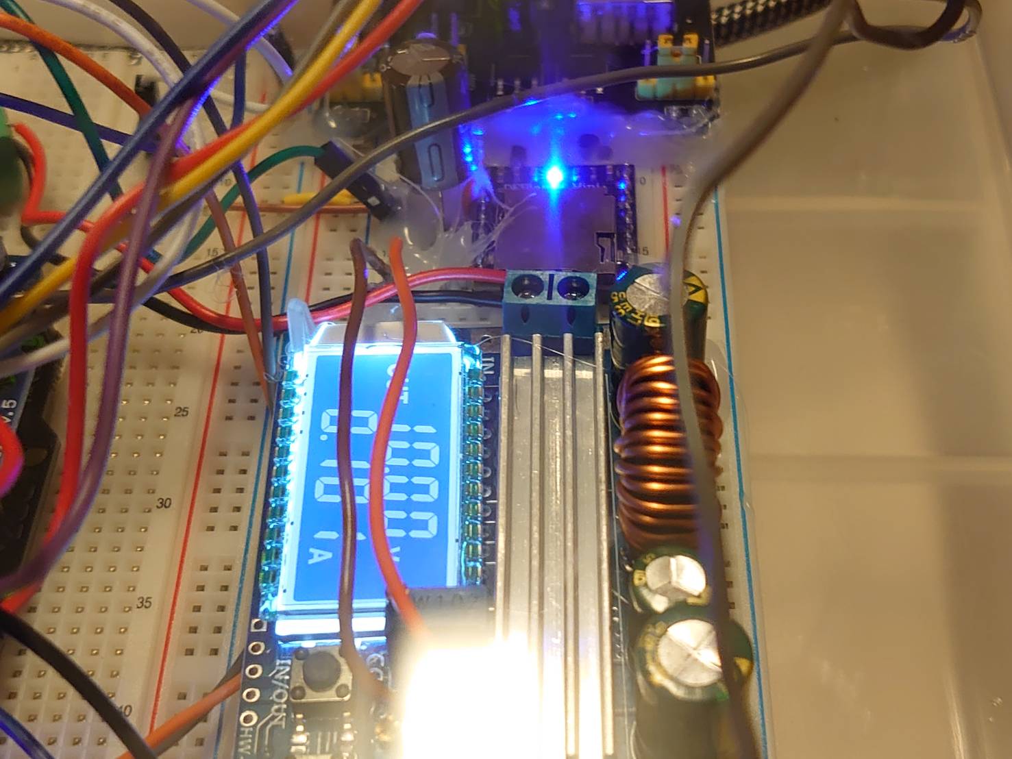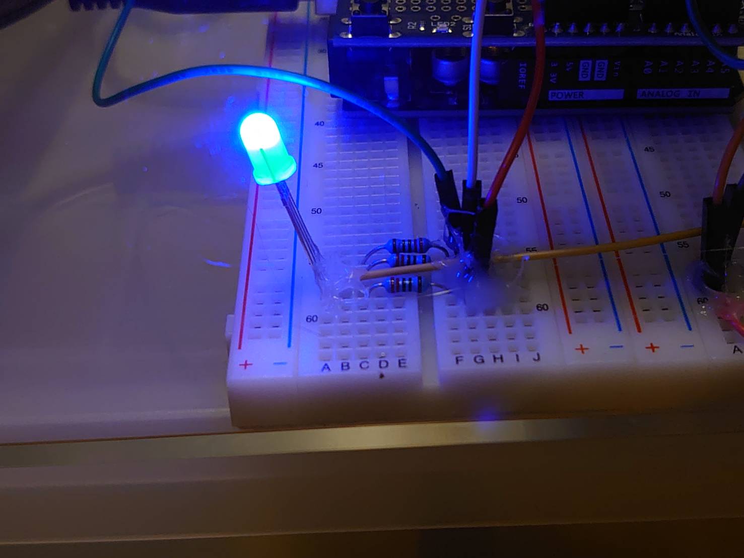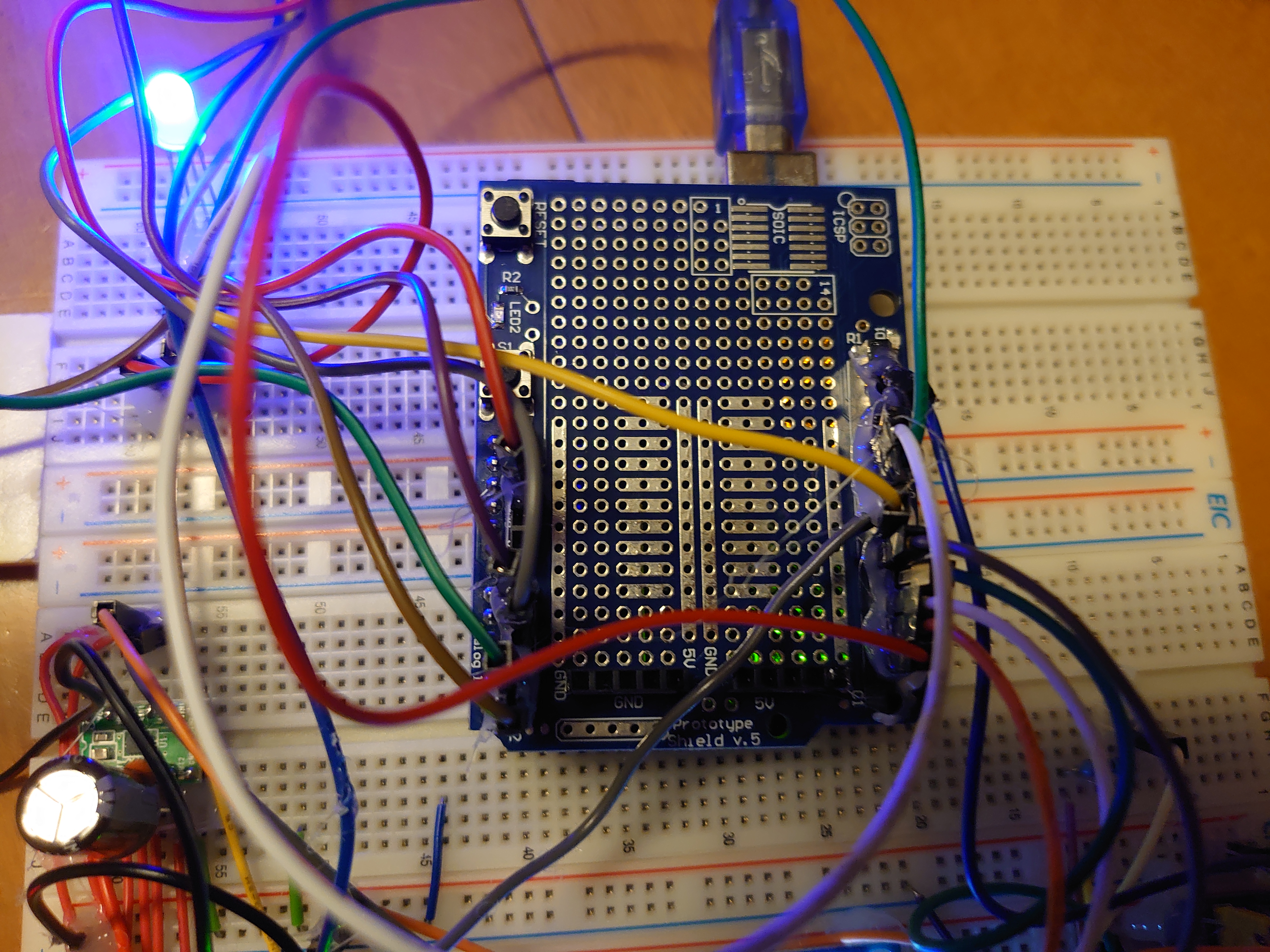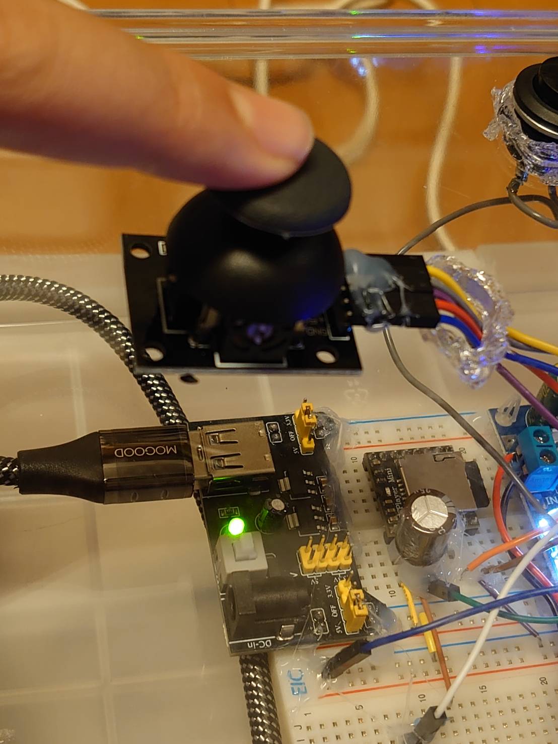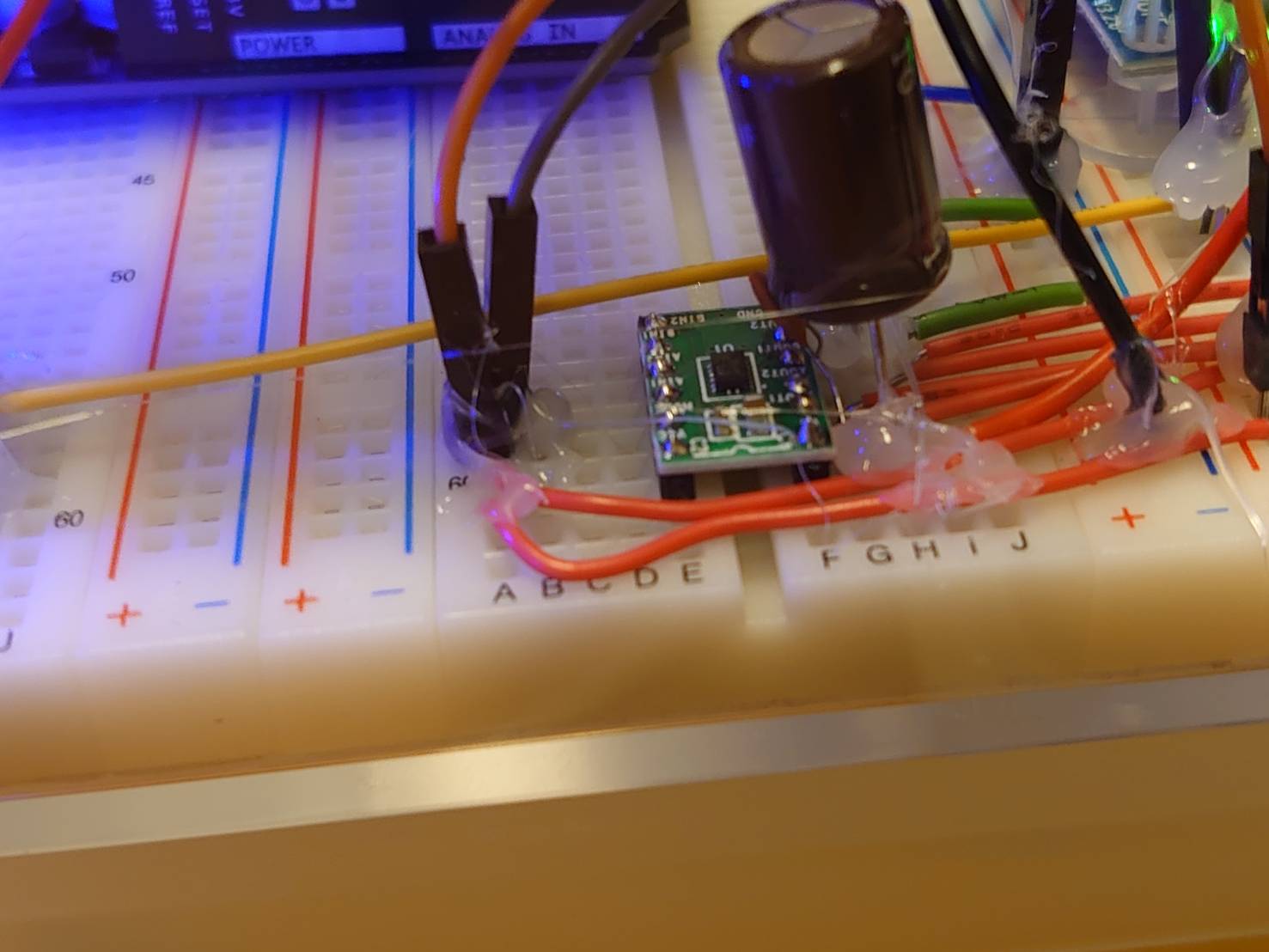 なるべくはんだ付けをせず、ブレッドボードとジャンパワイヤで組みました(外れ防止にグルーガンで固定)。