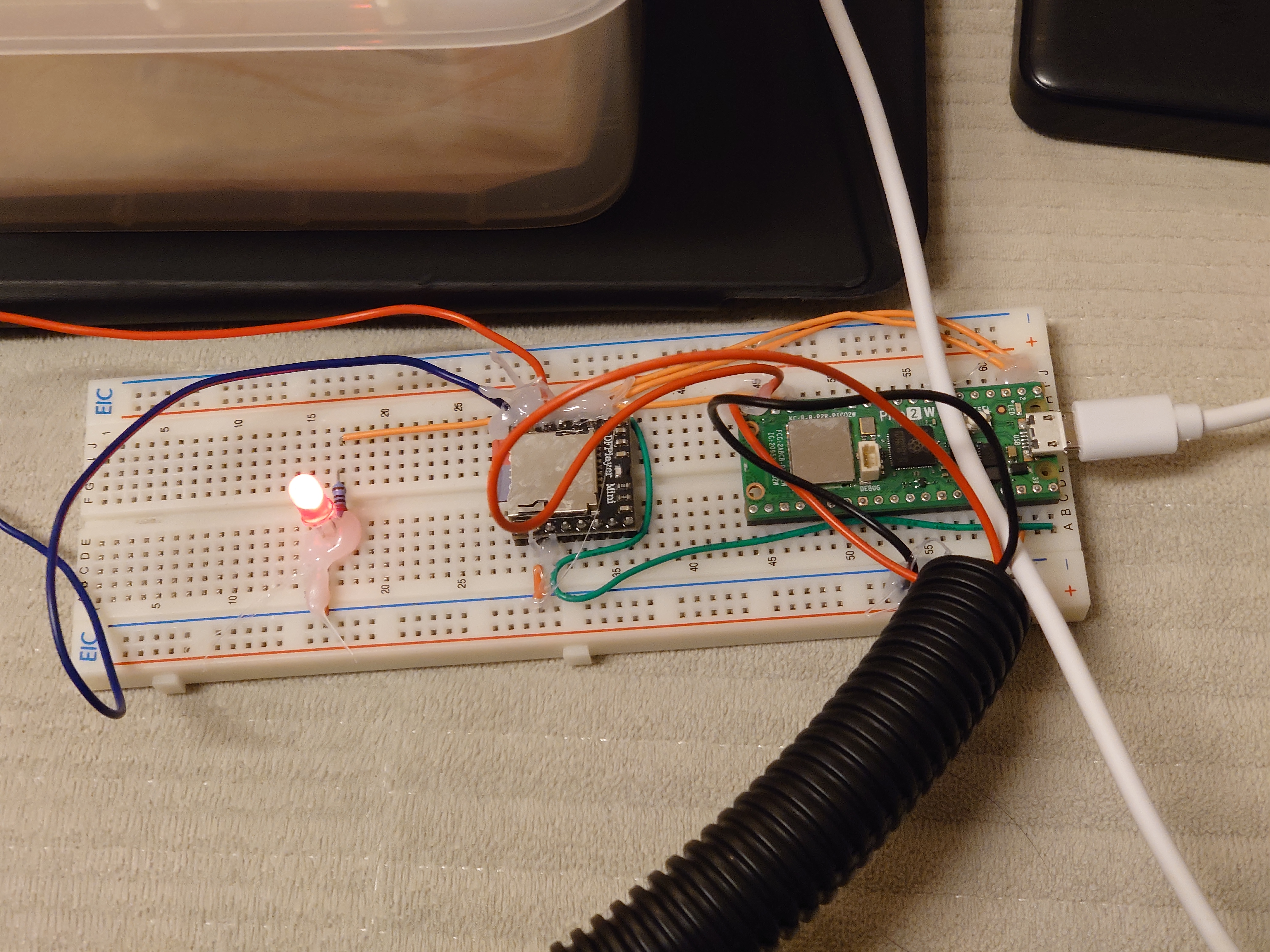 | DFPlayer mini | VCC / GND | Raspberry Pi Pico 2 W | VBUS(5V)/ GND | Pico から給電 |